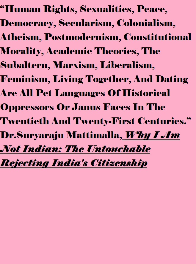 Am Not Indian: The Untouchable Rejecting India's Citizenship" https://www.amazon.de/-/en/Suryaraju-Mattimalla-ebook/dp/B09MDXFTY2/ref=sr_1_2?qid=1637756966&qsid=261-0591308-5553230&refinements=p_27%3ASuryaraju+Mattimalla&s=digital-text&sr=1-2&sres=B09MDZM1Q2%2CB09MDXFTY2&text=Suryaraju+Mattimalla