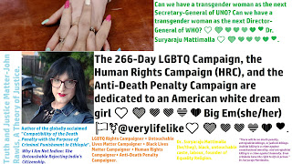 Please join me and support my Day-300 online LGBTQ + Human Rights Campaign (HRC) + Anti-Death Penalty Campaign on Twitter, blogs, Facebook, and poems for 400 days campaign to elect a transgender woman as Secretary-General of the United Nations Organization and Director-General of the World Health Organization.